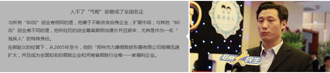 鄭州市力康假肢矯形器有限公司(簡稱力康),是一家專業(yè)從事假肢矯形器的設計、研發(fā)、制作及裝 配的專業(yè)機構。成立于1992年是河南省唯一一家福利企業(yè)。力康下設業(yè)務部、技術部、住院部、康復 部、售后服務部,并配有現(xiàn)代化的裝配車間和功能齊全的訓練大廳,為殘疾朋友康復訓練提供了可靠 保障。總經(jīng)理穿戴假肢多年,有著豐富的臨床經(jīng)驗和親身體會;多年來,力康已為全國幾十萬名殘疾 朋友安裝上舒適、美觀、耐用的假肢和矯形器具,使他們更大限度地恢復了正常的工作和生活。“產(chǎn) 品即人品”的質量理念、先進的技術、實惠的價格、完善的售后服務是力康取勝的法寶……
